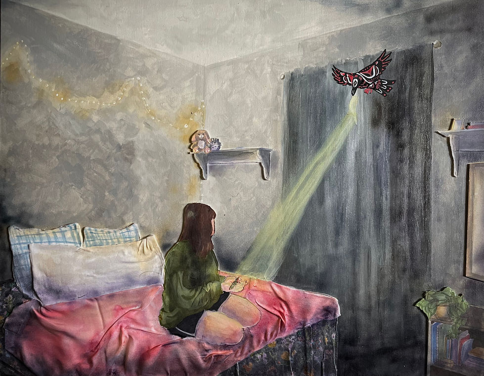 kḿańt haʔ yutĺx x̌iyáɬnxʷ (How Raven Brought the Sun) is inspired by Salish stories of Raven; a trickster who also brought the sun to the Earth and thus created life on Earth. I felt drawn to the duality of a tricker and a creator, in association with my mental health journey. kḿańt haʔ yutĺx x̌iyáɬnxʷ (How Raven Brought the Sun) depicts Raven providing me light, but I am unsure of Raven's intentions. This mirrors my journey with depression, always being unsure of what the future holds.
